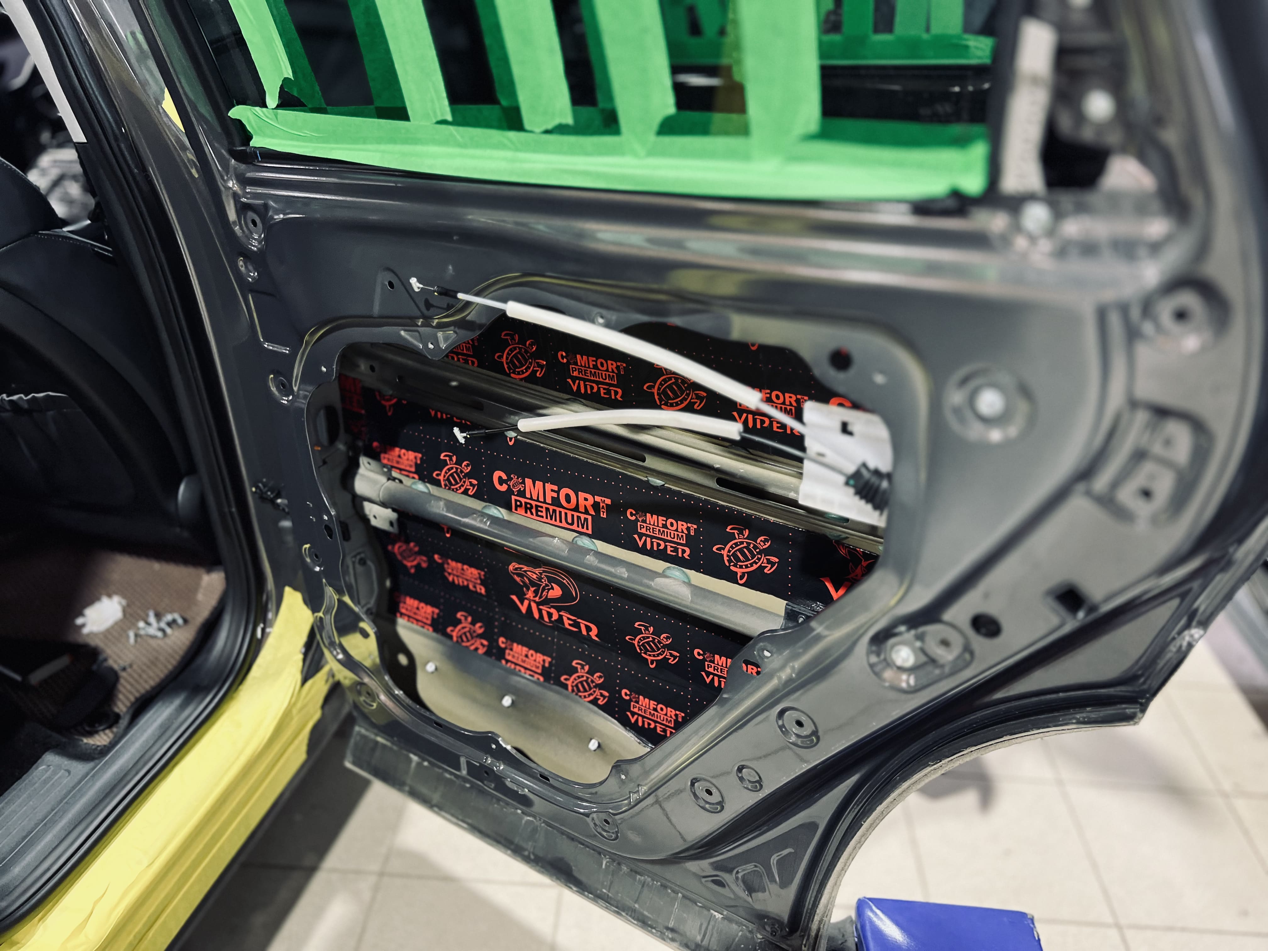 Первым слоем на двери и дверь багажника нанесли виброизоляцию Comfort Mat Dark Cobra.